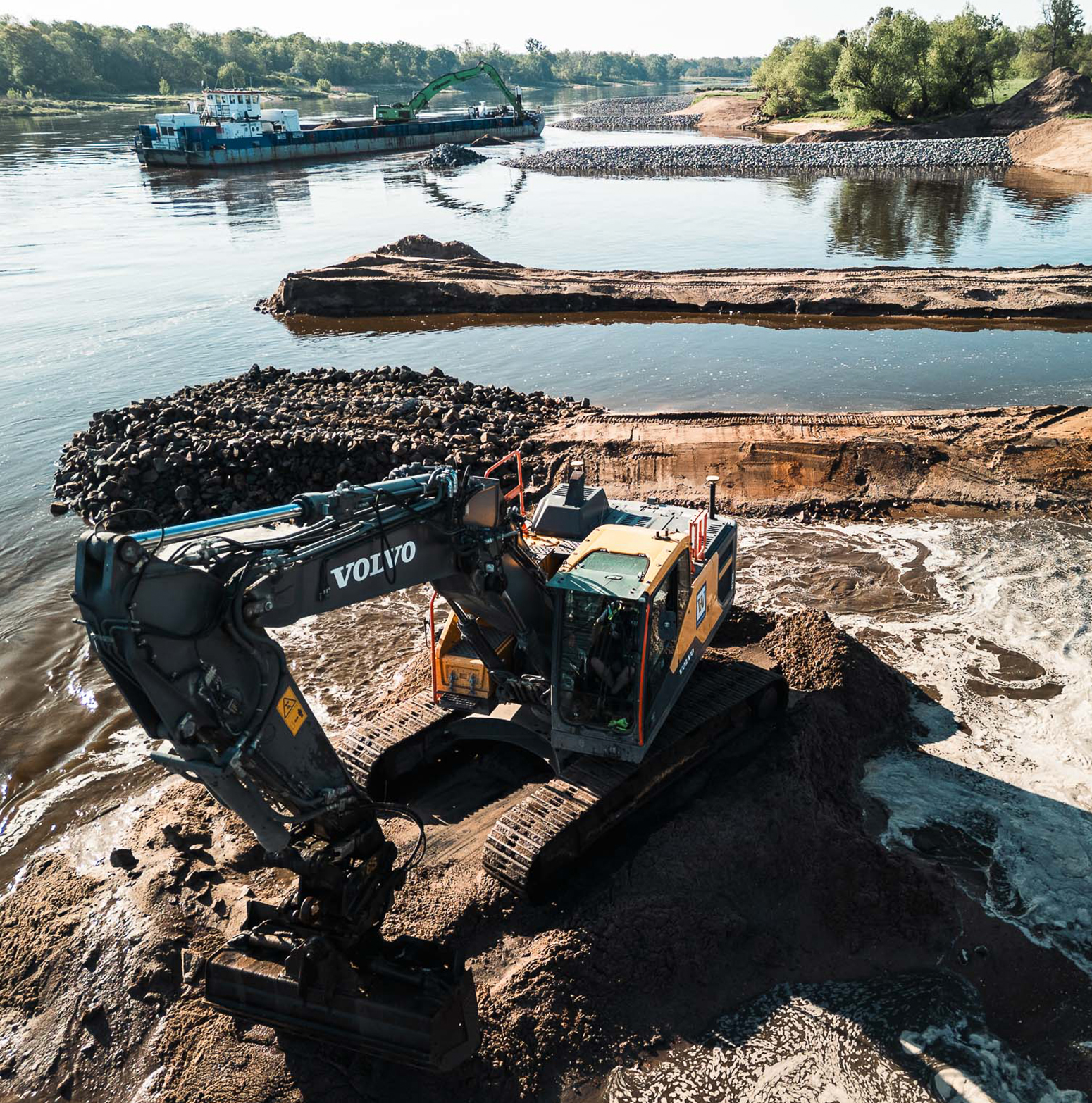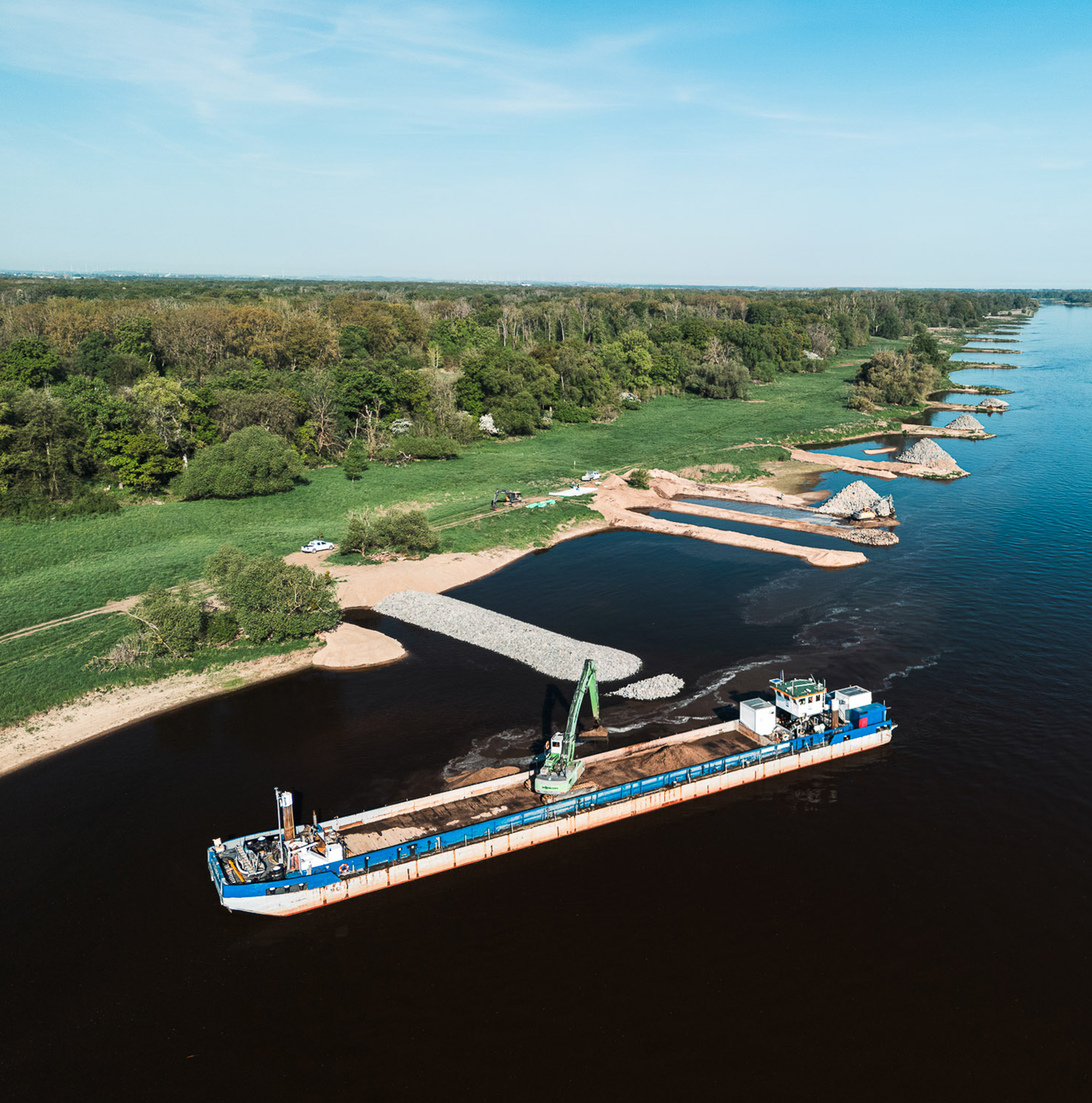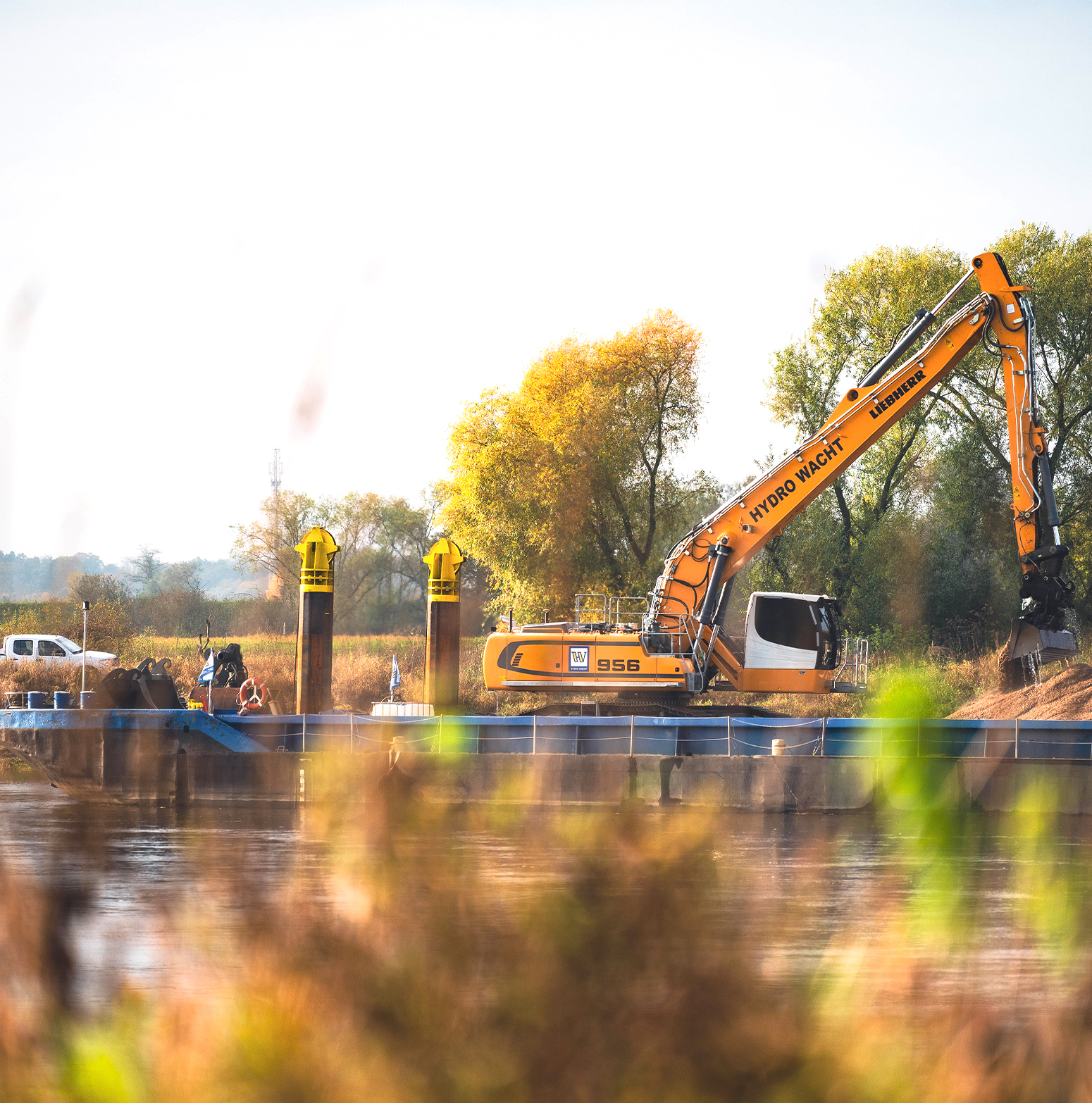 Ob Buhnenbau bei extremen Wasserständen und Strömungsgeschwindigkeiten oder Hafenbau mit ambitionierten Spundwandlängen – mit mehr als 25 Jahren Erfahrung und spezialisierten schwimmenden Einheiten löst Hydro Wacht jede Herausforderung im Wasserbau.